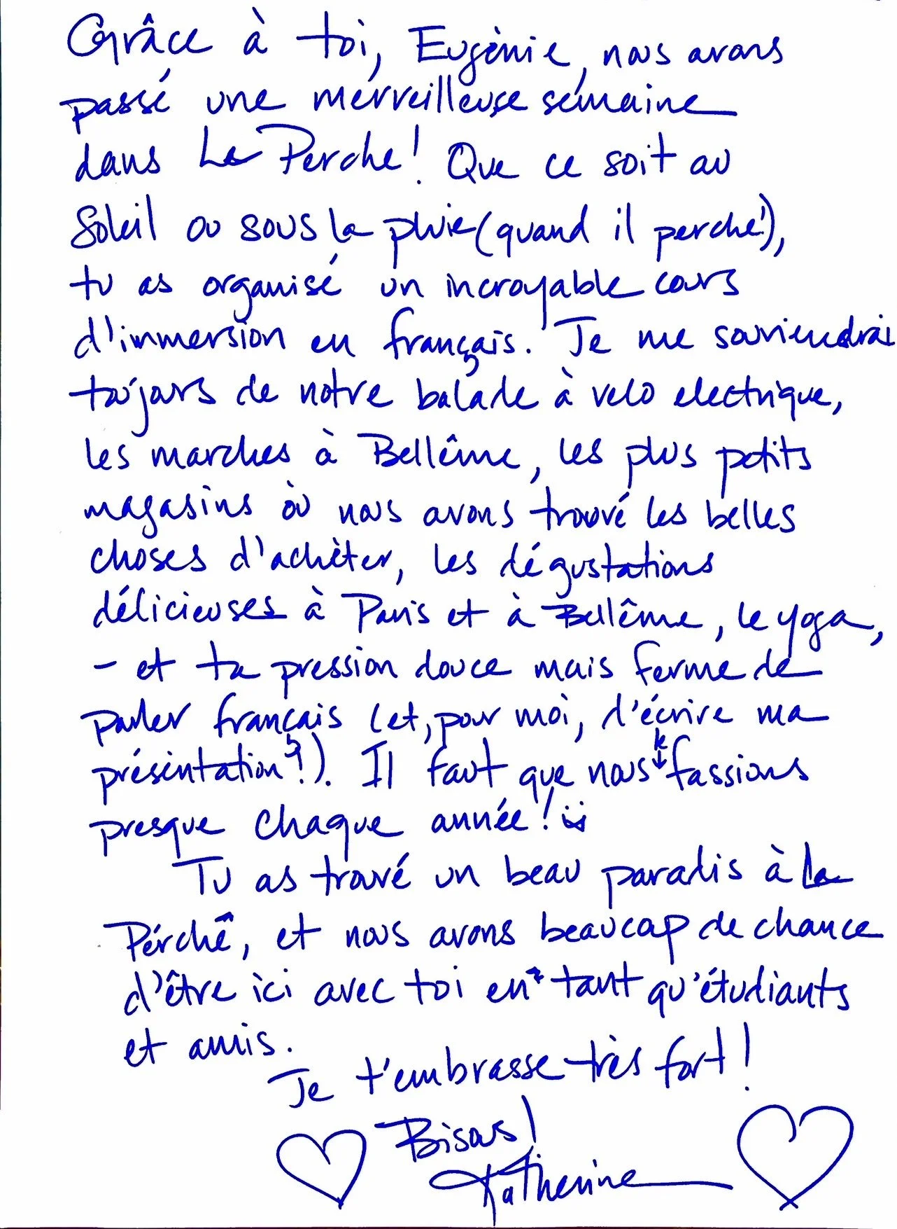 I'd very much like to leave a review of the wonderful retreat I took part in in Normandy, in the very typical little village of Le Perche. I spent three days of complete and comfortable immersion in the French language, cuisine and way of life in a wonderful environment of nature, Normandy forests and of course surrounded by extraordinary people with whom we spent wonderful moments of camaraderie. Eugénie welcomed us into the peaceful and very warm, traditional and welcoming atmosphere of her estate in the middle of woods and fields! I discovered and loved this region through cycling, the forest, visits to nearby towns and a visit to a real local market with delicious regional gourmet and natural products, which we were able to fully appreciate thanks to the culinary talents and skills of the hostess! The energy and atmosphere of the house gave me four wonderful nights of deep, restful sleep without a care in the world. Eugénie's professionalism and quality of teaching allowed me to miraculously identify and correct in the shortest possible time pronunciation and articulation problems that I thought were already permanently fixed on me due to my accumulated habits during my twenty years in France - it's AMAZING 🔥